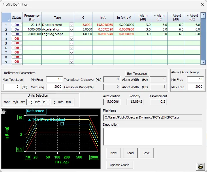 When you make changes to the profile, click on Update Graph to see the results in the graph. Once the profile has been defined, you can drag the mouse using the left mouse button to define your input and frequency which will be displayed in the Vibration Calculator dialog.