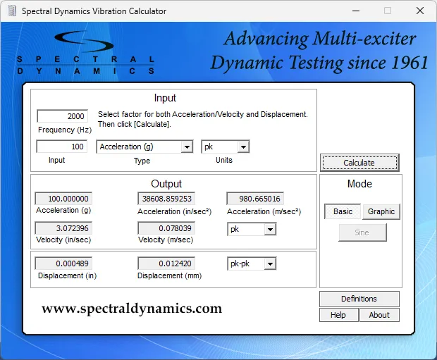 Spectral Dynamics' Vibration Calculator can be operated in both a Basic text or Graphic based calculator.