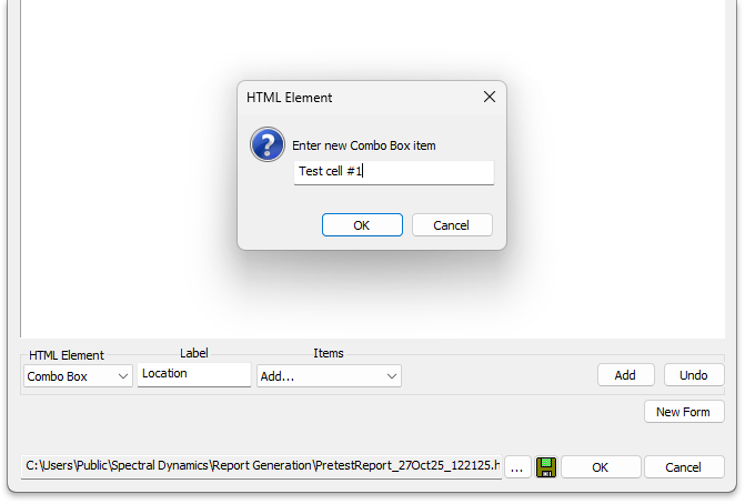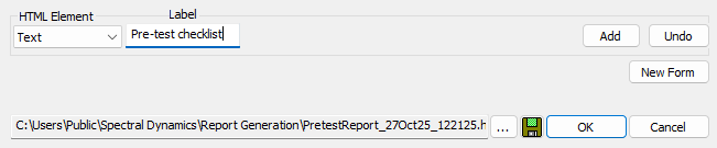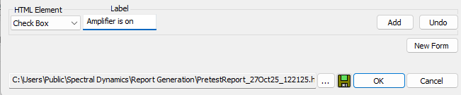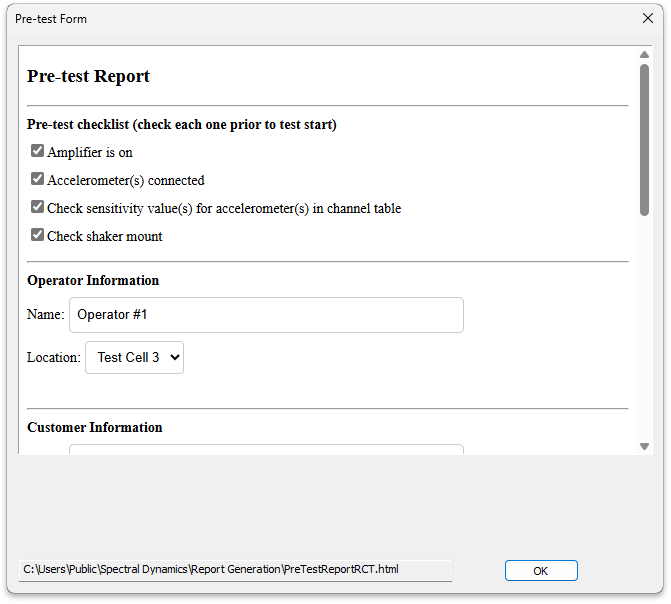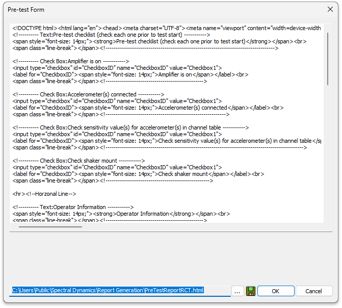 When finished adding HTML Elements, click [OK] to use the existing pre-generated file name or the save icon to give it a different name or location. As long as the Pre-test check box is enabled in the Report Generation dialog, this newly created form will appear with the operator starts the test. The test will not continue until the operator clicks [OK] on the form dialog. Below is an example form created using only HTML Elements provided in the [Create] dialog functionality.