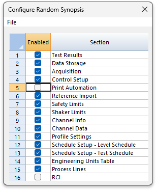 A test synopsis is a customizable collection of test results and setups used in the test. Select "Include Test Synopsis" then [Configure Synopsis] button. Each one of these sections (if checked) will be appended to the end of the report as text-based data.
