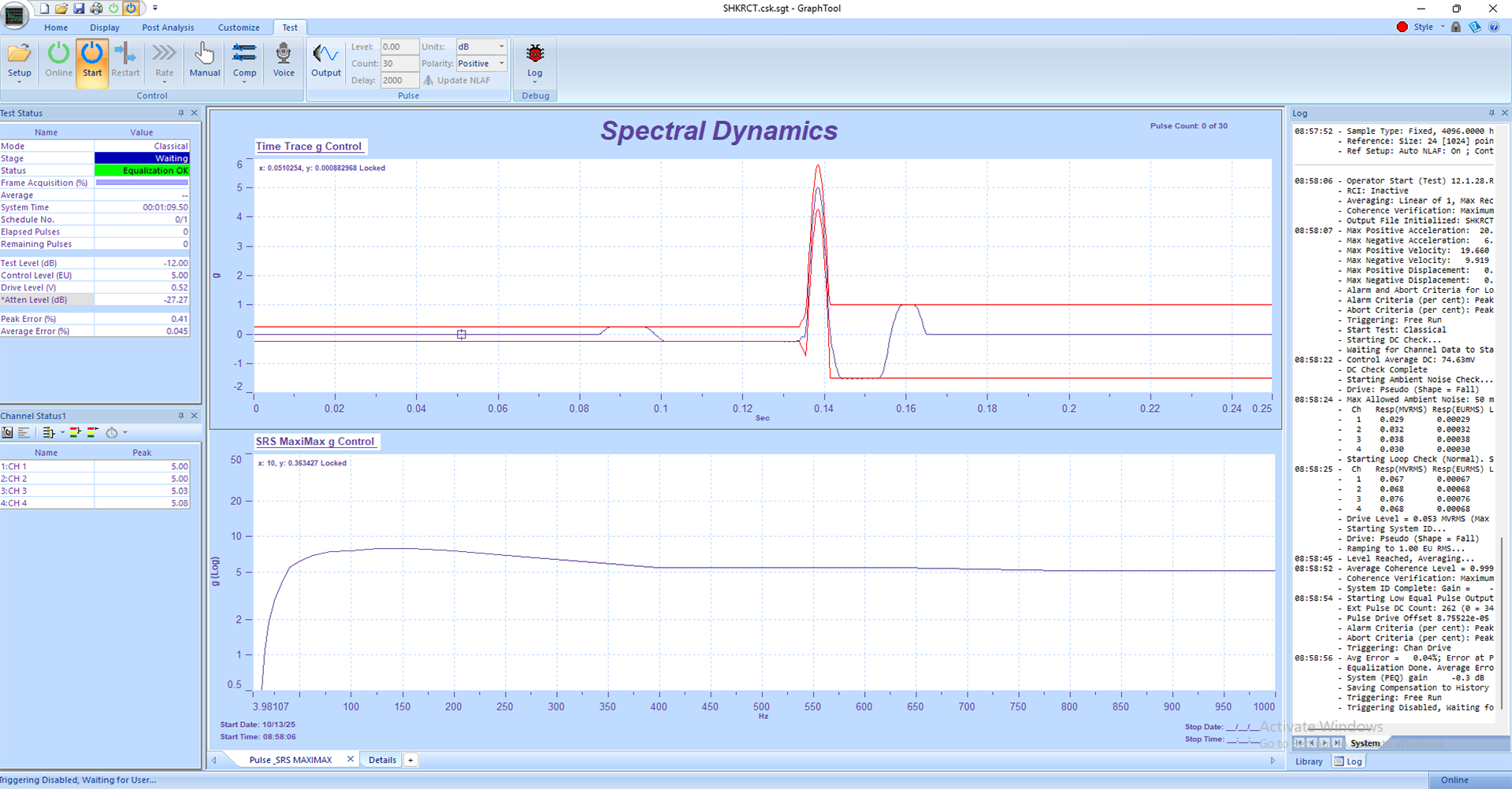 5. Observe real-time plots of frequency response, control amplitude, and phase in GTX. Use the Status Panels to monitor RMS levels and safety indicators.