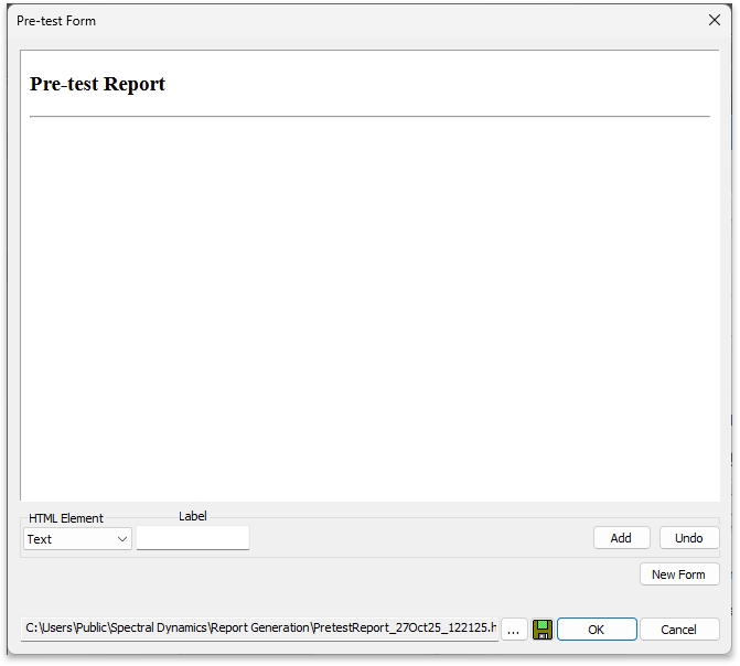 When finished adding HTML Elements, click [OK] to use the existing pre-generated file name or the save icon to give it a different name or location. As long as the Pre-test check box is enabled in the Report Generation dialog, this newly created form will appear with the operator starts the test. The test will not continue until the operator clicks [OK] on the form dialog. Below is an example form created using only HTML Elements provided in the [Create] dialog functionality.