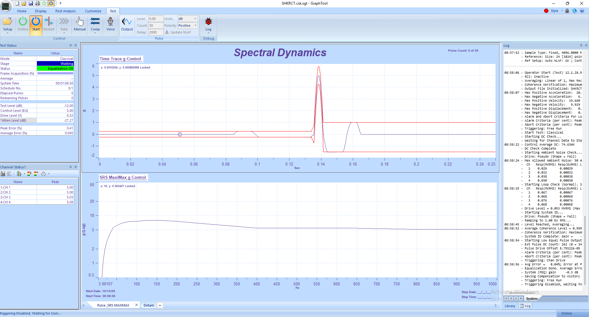 Shock employs a patented adaptive equalization technique. Not a “Once per test”, amplitude only correction, Shockbut “adapts amplitude and phase” on every shock pulse to correct for non-linear conditions on both hydraulic and electrodynamic exciters.